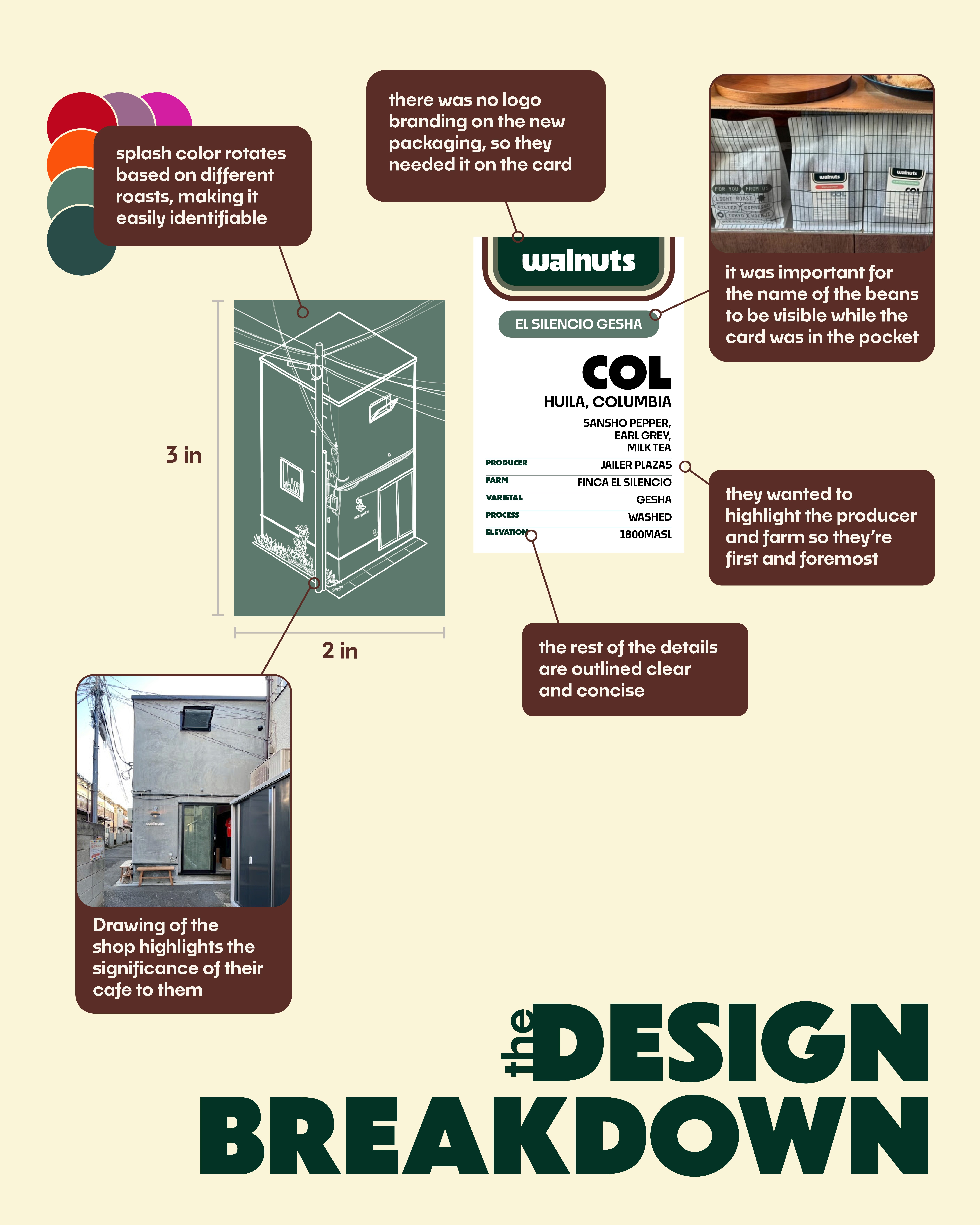 The bag itself has no logo branding so most importantly they needed the card to be the branding marker. Designing a tasting card that reflects the Walnuts brand. Since they're still trying to nail down what their brand is these cards needed to feel cohesive to their mid century modern interior. Bringing their brand emotion home with the customer.Tasting cards are also very imformation heavy so they wanted everything to be in an easily digestible format.