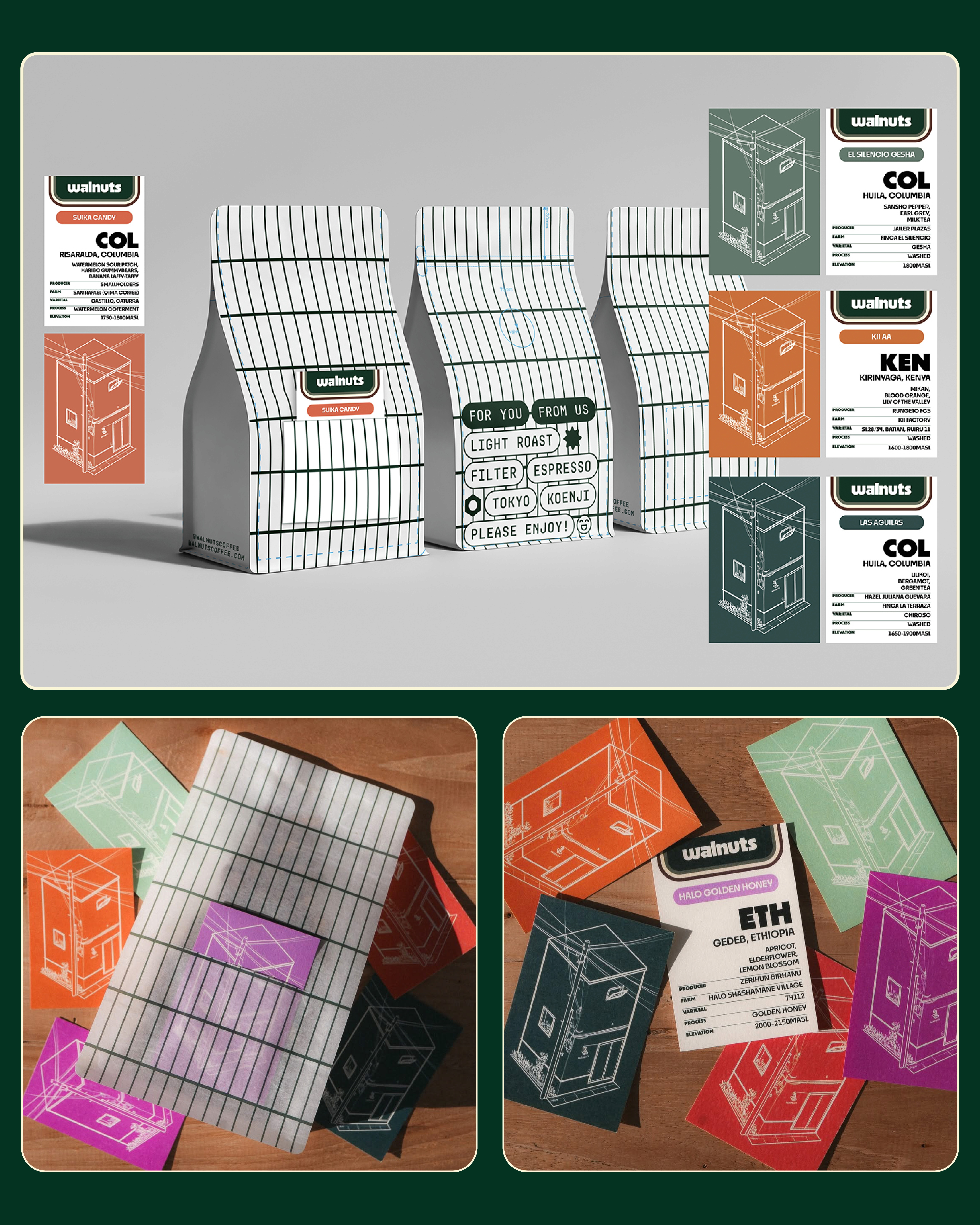 Walnuts is a contemporary microroastery and cafe space based in Tokyo, Japan.They were in need of their own branded tasting cards to go with their own coffee bean blends. Something that would fit in the pouch of their coffee beans packaging.
